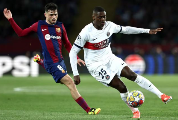 第6分钟,阿什拉夫前场带球突破跟阿德耶米相撞后倒地,主裁判没有表示。第11分钟,登贝莱禁区外围抽射远角,皮球直接打偏。