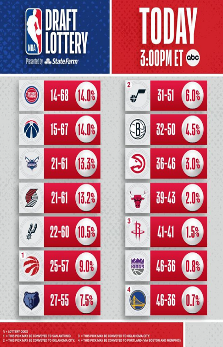 在乐透抽签开始前,各队获得状元签的概率如下:活塞和奇才各有14%,黄蜂13.3%,开拓者13.2%,马刺10.5%,猛龙9%,灰熊7.5%,爵士6%,火箭6%(篮网的签4.5%,自己的签1.5%),老鹰3%,公牛2%,国王0.8%, 勇士0.7%。